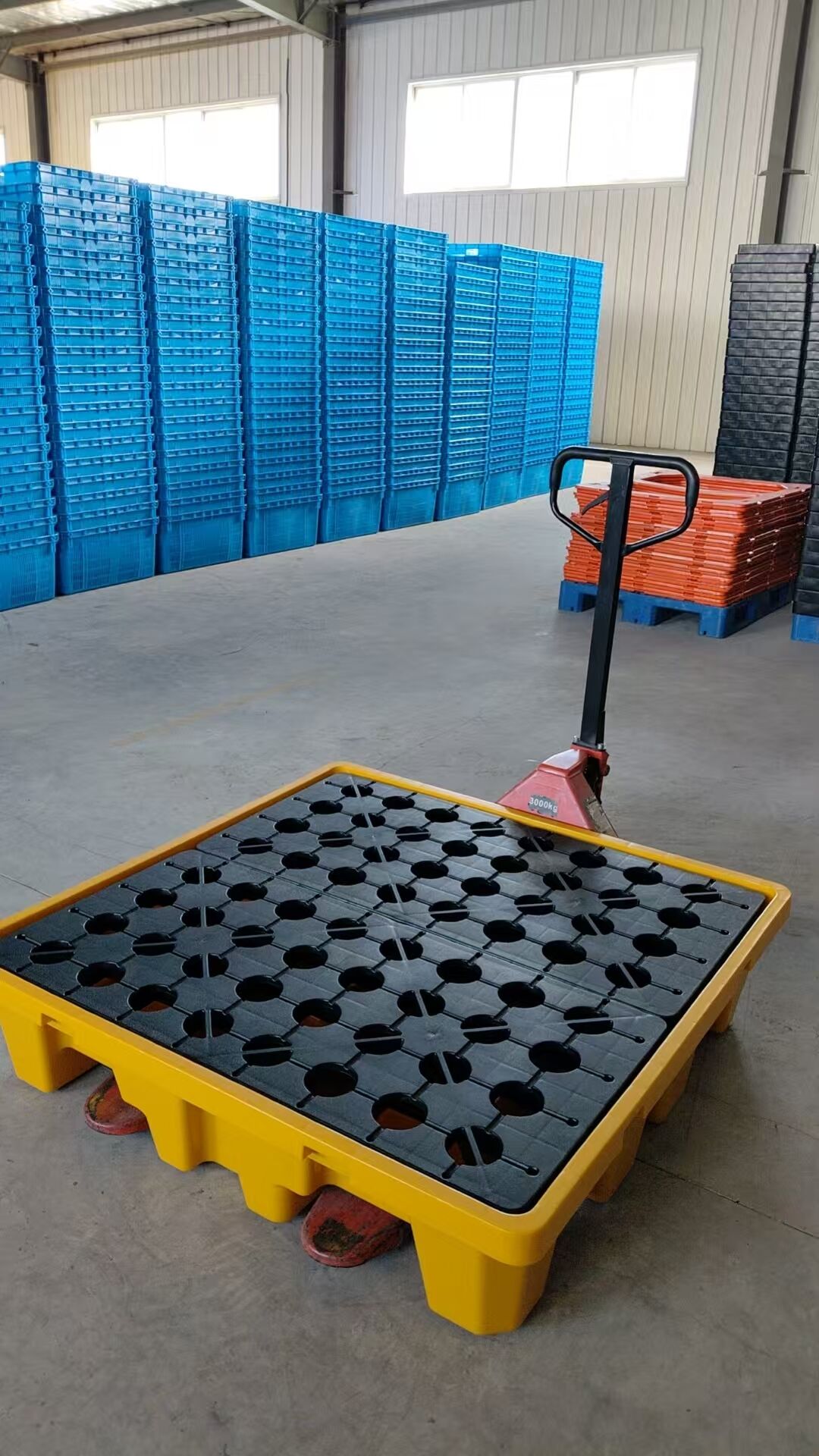 HDPE anti leakage plastic tray 1320 * 1300mm, suitable for storing chemical packaging drums, can hold 200Lx4 drums.